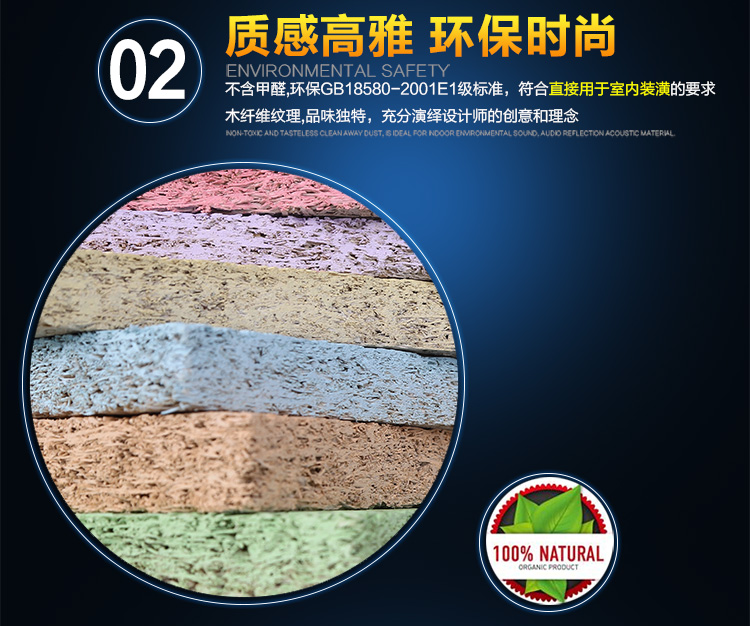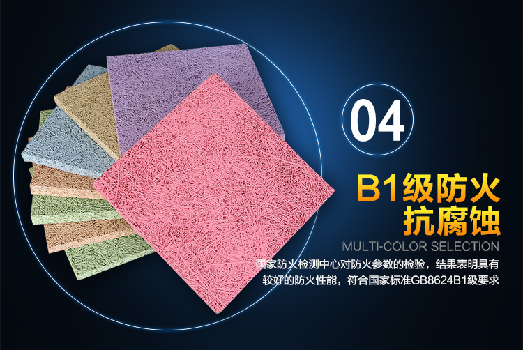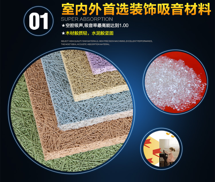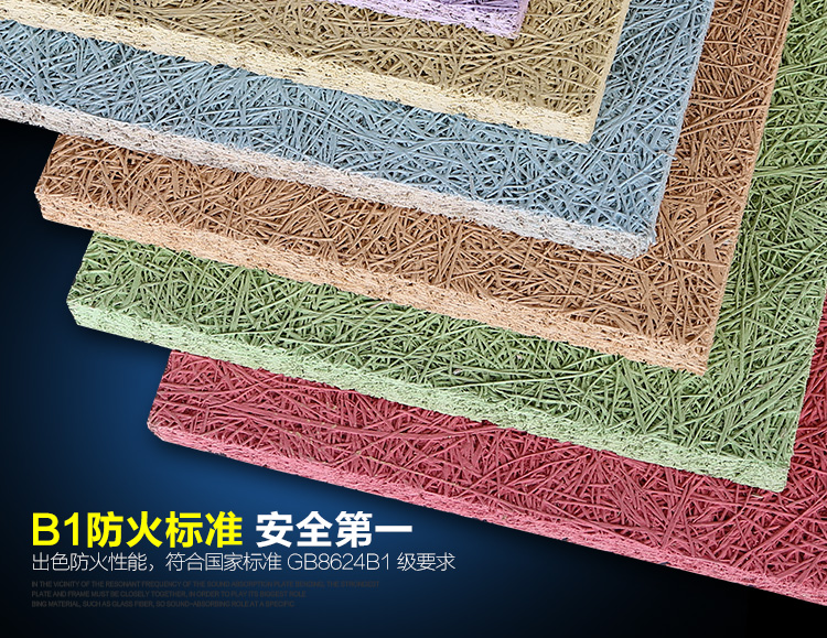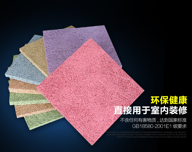 外观独特、吸音良好--独有的表面丝状纹理,给人一种原始粗犷的感觉,满足了现代人回归自然的理念。表面可做饰面喷色和喷绘处理,喷涂可达六次。吸音率最高能达到1.00。