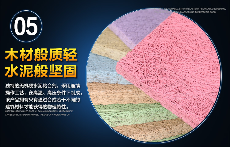 木丝吸音板以白杨木纤维为原料,结合独特的无机硬水泥粘合剂,采用连续操作工艺,在高温、高压条件下制成。该产品拥有只有通过合成若干不同的建筑材料才能获得的物理特性。