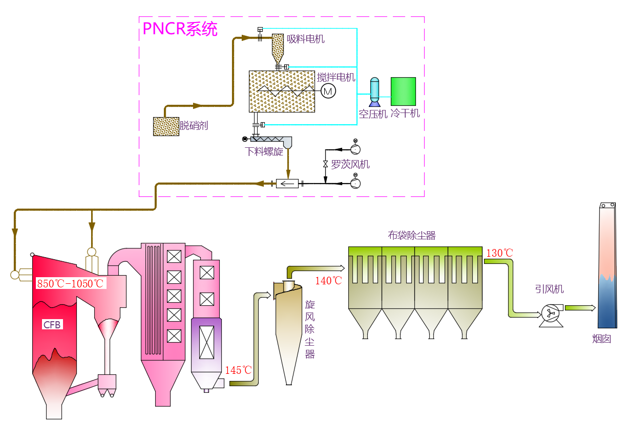 固态高分子PNCR脱硝工艺也是一种炉内脱硝工艺,其基本原理类似于传统的SNCR方式。